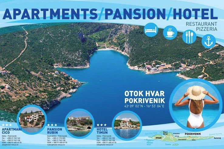 Timun Hotel liegt in der wunderschönen Pokrivenik Bucht auf der Nordseite der Insel Hvar, in der Nähe Gdinj. Es liegt in einer ruhigen Umgebung in der Nähe der Küste. Es verfügt über 14 Zimmer. Das Hotel verfügt über ein eigenes Restaurant mit à la carte-und Buffet-Angebot, das Essen ist a...
