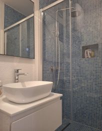 Das Appartement hat Terrasse mit Meerblick, Schlafzimmer, Wohnzimmer, Kochnische und Bad.