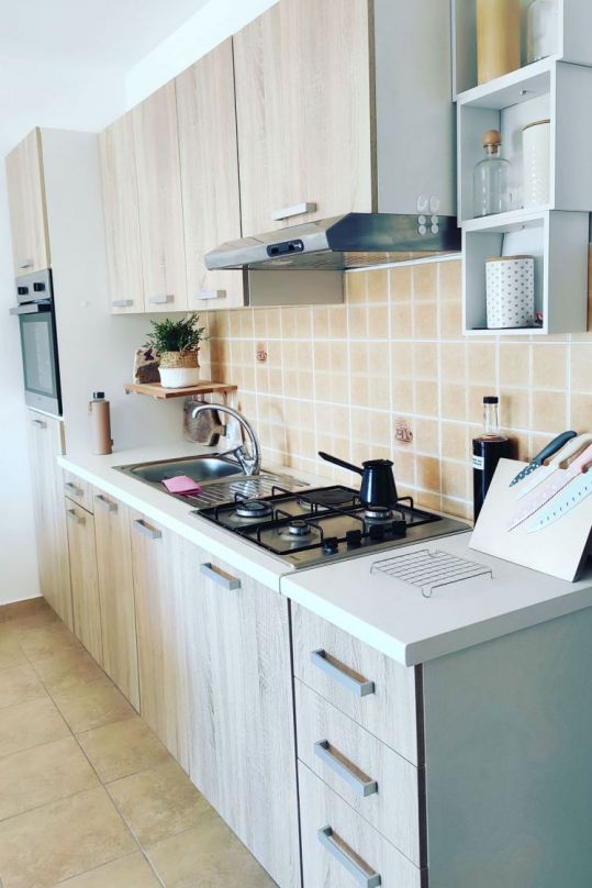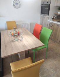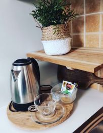 Terrasse: 5m2 Küche Backofen Mikrowelle Kaffeemaschine Kühlschrank Geschirr und Besteck