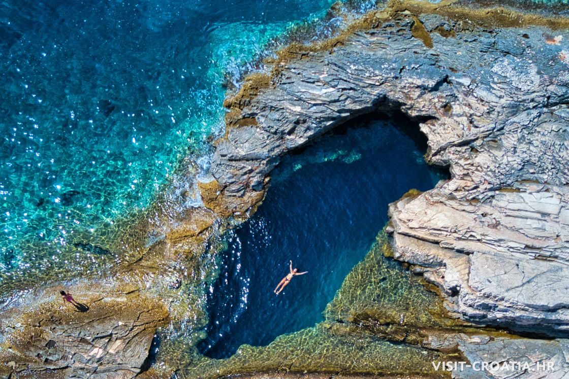 In the bay of Brbišćica on the southwestern side of Dugi otok is a natural phenomenon called Zmajevo Oko (Dragon's Eye). It was formed by the wear of the limestone rock in which it is located. Experienced swimmers and divers with enough courage can dare and dive through the underwater corridor that separates Zmajevo Oko from the sea. The whole bay of Brbišćica is an interesting geomorphological location because of traces dating to the prehistoric time that were discovered in the immediate vicinity of the bay. Namely, a dinosaur fossil was found on the steep slopes, so the bay area has been declared a protected natural landscape. The interesting sea cave Golubinka is another natural attraction that is located in the bay Brbišćica near Zmajevo Oko.