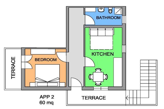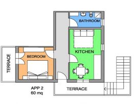 45 m2 - 1. kat - Broj soba: 4, Broj kupaonica: 1, Broj bračnih ležajeva: 1, Broj osoba na glavnim ležajevima: 2, Broj osoba na pomoćnim ležajevima: 2