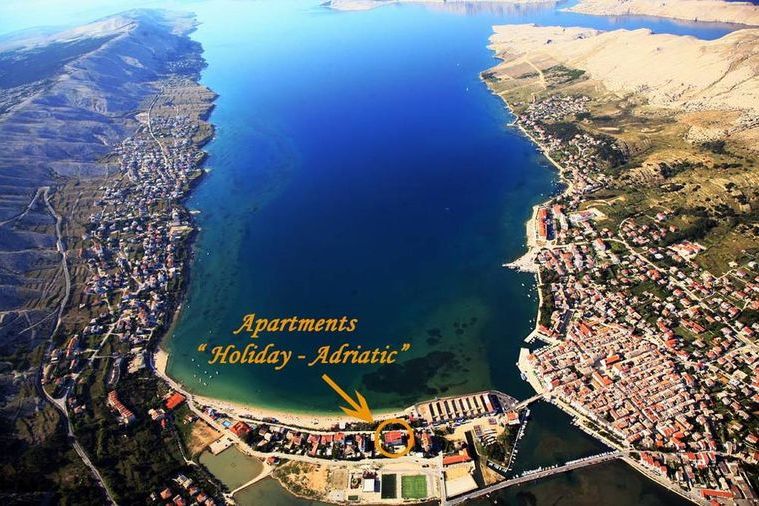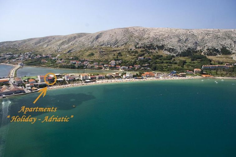 La più grande spiaggia in prossimità del centro storico è Prosika, ed il Golfo di Pag dispone di 27 km di spiagge di sabbia, ghiaia e pietra, tra cui le più famose e le più belle sono Zrće, Janjeće vode, Beritnica, Sveti duh, Sveti Marko, Dubrava, Bošana, Caska, Ručica, Slana, Malin, Veliki zaton, Bijele stijene, Veli bok, Mali bok e Kotica.